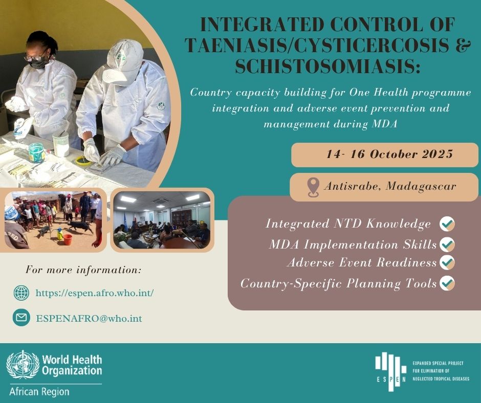 ESPEN, in collaboration with WHO AFRO and partners, is convening a regional One Health Workshop in Antsirabe, Madagascar, from 14–16 October 2025. This workshop will focus on building country capacity for the integrated control of Taeniasis/Cysticercosis and Schistosomiasis, with a strong emphasis on adverse event prevention and management during Mass Drug Administration (MDA).